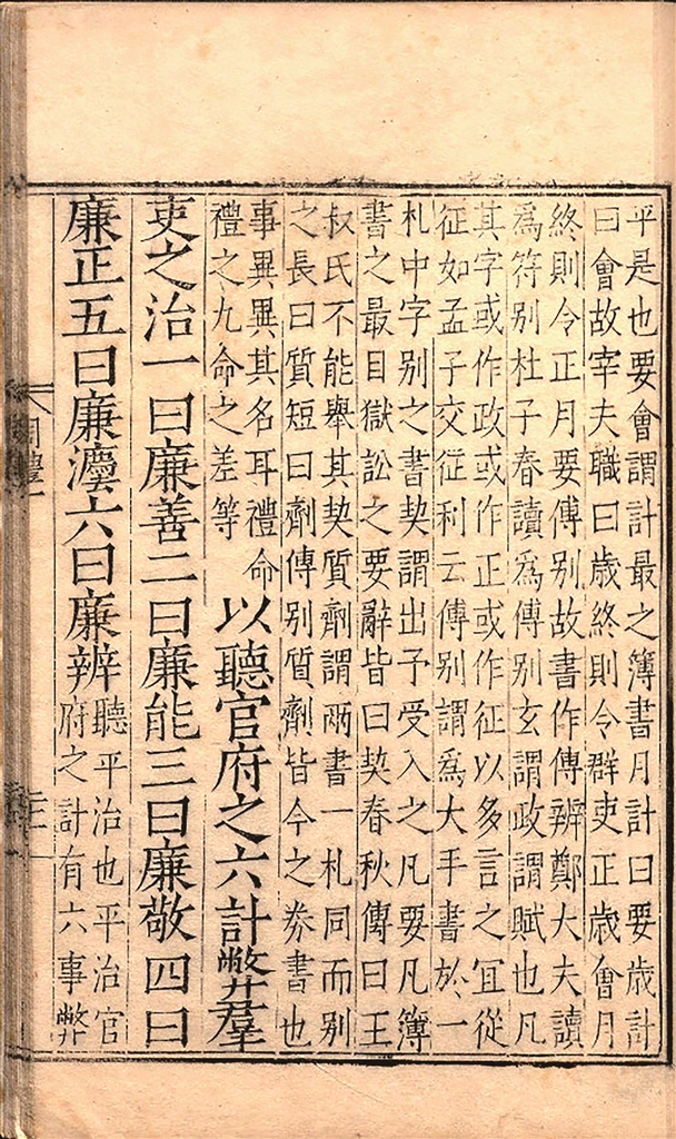 《周礼·天官冢宰》载:“以听官府之六计,弊群吏之治。一曰廉善,二曰廉能,三曰廉敬,四曰廉正,五曰廉法,六曰廉辨。”“六事”前面均加上了一个“廉”字,既以“六事”评断官吏,同时又“以廉为本”。图为《周礼》明刻本。 图片来源:中华古籍智慧化服务平台