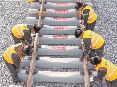 图为11月25日,工人在黑龙江省绥化市庆安县永华村哈伊高铁哈铁段铺轨现场工作。 新华社记者 王松 摄