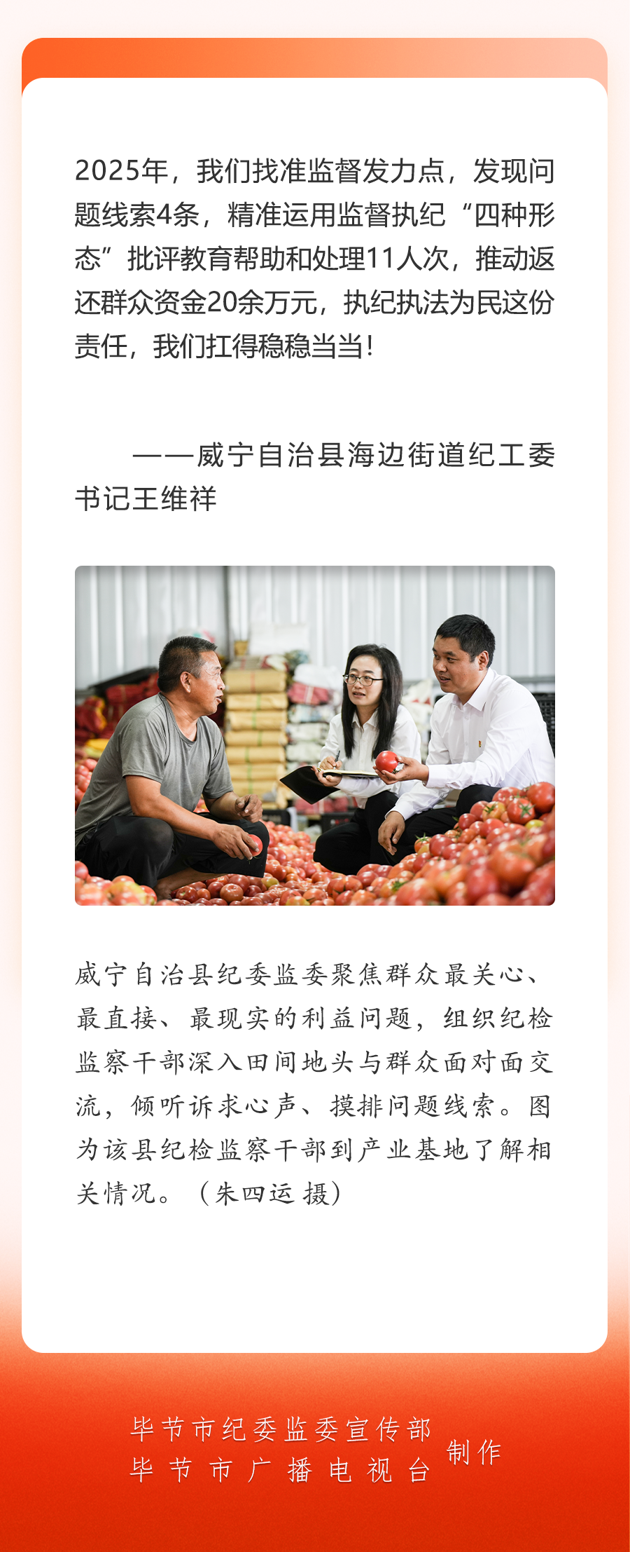 2025年,乌蒙大地清风劲吹,毕节市正风肃纪反腐步履坚实。纪检监察工作成效,最终要由广大干部群众来评判,在具体实践中检验,在可感可及中彰显,在细节实事中体现。它不仅是会议室里的安排部署,更是田埂上群众手中的补贴、校园里的热乎饭菜、柴米油盐中的减项降费;它不仅是文件里的纪法条文,更是干部轻装快跑的脚步、重大项目奋勇攻坚的火热、窗口高效便捷的服务、市场亲清规矩的交往。